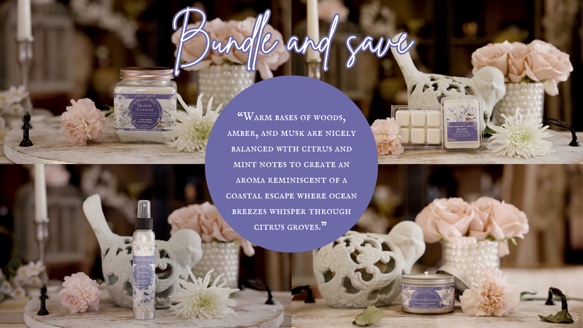 "Warm bases of woods, amber, and musk are nicely balanced with citrus and mint notes to create an aroma reminiscent of a coastal escape where ocean breezes whisper through citrus groves."